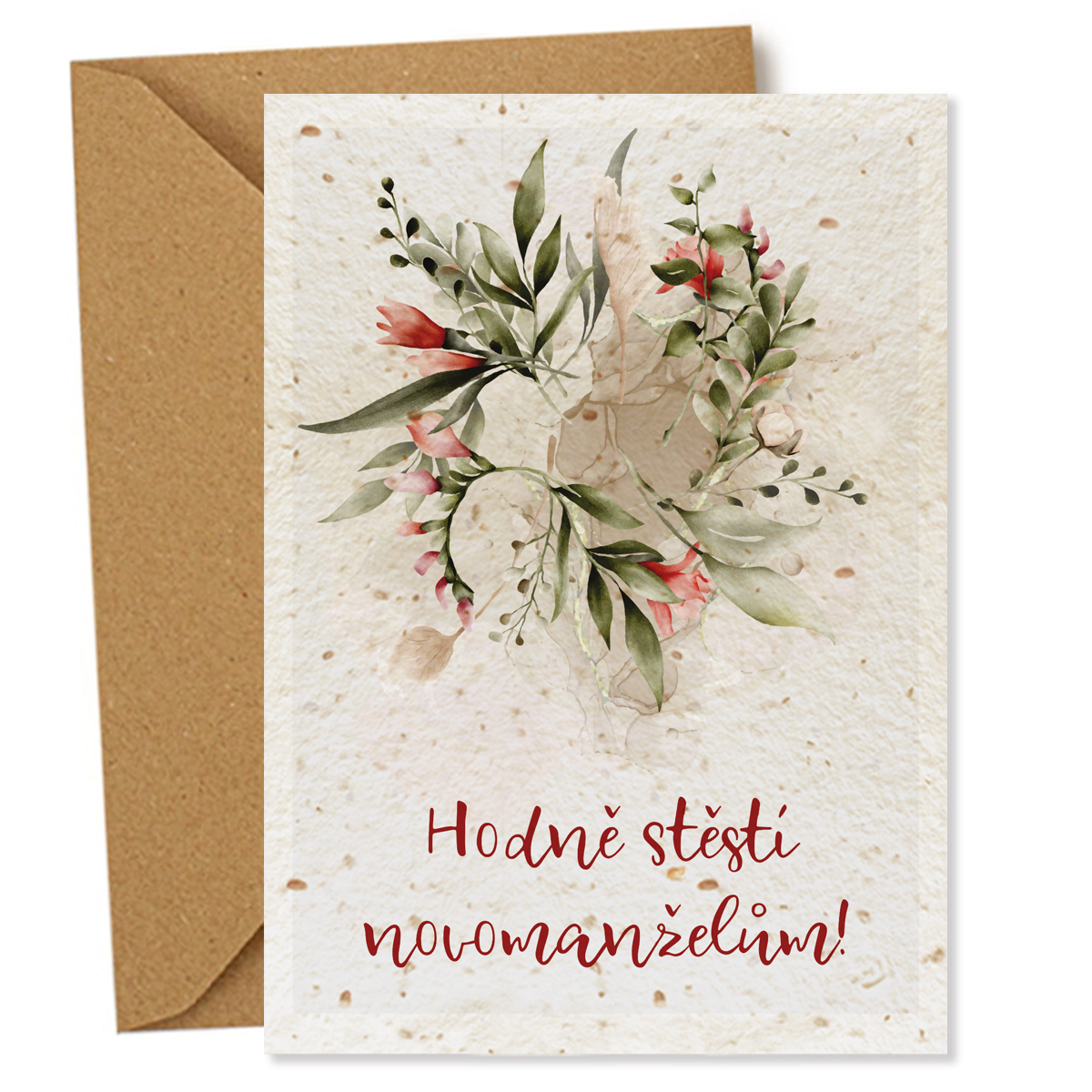 • Bonus pro vás: Ke každému přání přikládáme stylovou pečeticí samolepku na zadní stranu obálky. Ta novomanžele hned upozorní, že v rukou drží výjimečný papír se semínky, který stačí zasadit a nechat rozkvést.