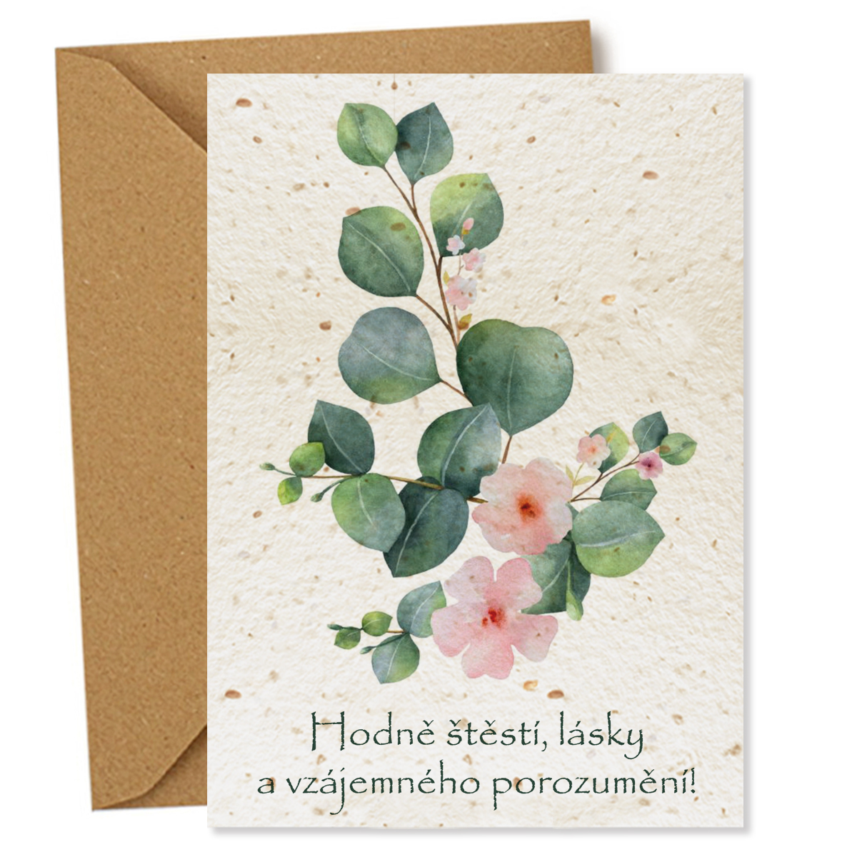 • Bonus pro vás: Ke každému přání přikládáme stylovou pečeticí samolepku na zadní stranu obálky. Ta novomanžele hned upozorní, že v rukou drží výjimečný papír se semínky, který stačí zasadit a nechat rozkvést.