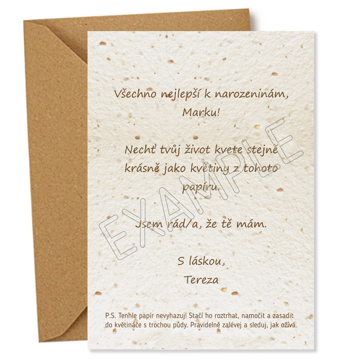 • Bonus pro vás: Ke každému přání přikládáme stylovou pečeticí samolepku na zadní stranu obálky. Ta obdarovaného hned upozorní, že v rukou drží výjimečný papír se semínky, který stačí zasadit a nechat rozkvést.